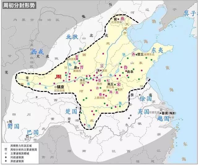 周人主要活动在渭河流域,是西戎北狄中的一支,后来依靠农业而兴起。在公刘期间初步建立了国家制度,在古公亶父时期进一步发展。季历时期,周国强盛起来,曾被商朝册封为“牧师”,称为西部的霸主,发展到了文王时期,正式称王,和商朝对立。周武王时期,灭商朝,将疆域扩张到了东方。周公东征,继续讲疆域扩展到了东海、黄淮一带。后来周昭王、周穆王、周宣王等不断对南方的楚国、徐国用兵,使得周朝的疆域达到了顶峰。其疆域北到燕山一带,东到大海,西到渭河上游,南到江汉淮地区。西周也同样实行分封制,主要的封国有鲁、齐、燕、晋、宋、卫、郑等。要注意的是楚国是和周朝是对立的国家,楚国国君称“王”,和西周国王并立,周朝也只是在名义上册封楚王为“楚子”而已,因此楚国不算西周的疆域。在整个西周历史上和楚国的战争几乎也是没有断绝过。