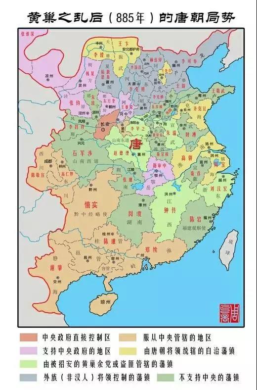 安史之乱后,唐朝进入了后期。唐朝后期,其内部藩镇割据不断,而唐朝的在西域、辽东、辽西的势力也退回了内地,以至于吐蕃占据了西域,契丹族在辽河流域强大起来。受到汉文化的影响,唐朝周边开始出现了一些比较强大的汉化政权,如南诏国、渤海国。