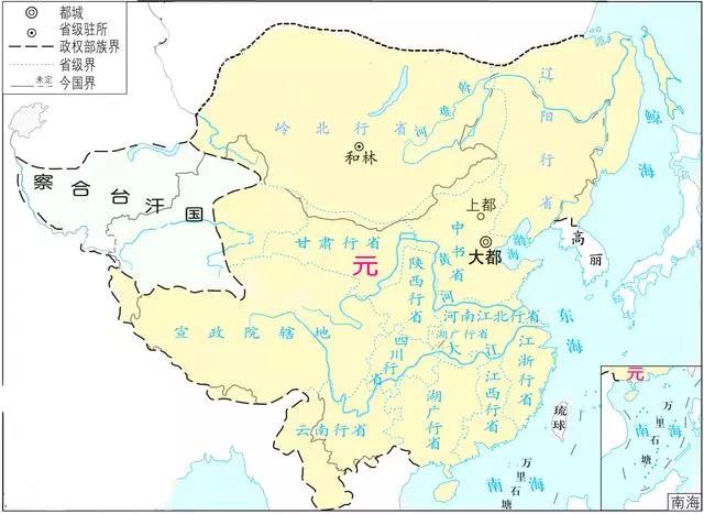 1206年,成吉思汗统一蒙古高原,建立了吗,蒙古汗国。随后蒙古通过三次,建立了横跨亚欧地区的蒙古帝国。在东亚,蒙古消灭了西辽、西夏、金国,大理,征服了高丽、吐蕃,不过由于蒙古实行了分封制,使得这个帝国很快就分崩离析了。1260年,忽必烈宣布继承蒙古大汗,因此引发了汗位之争。最终忽必烈虽然获得了胜利,但是其他的四大汗国却失去了控制,这也宣告蒙古汗国正式瓦解。1271年,忽必烈在北京正式宣布继位为中国的皇帝,建立了元朝。1276年,元朝灭南宋,正式完成了新的大一统。此时的元朝已经继承了蒙古汗国对西夏,金国,吐蕃,大理,高丽等地的管辖控制,并且首次将青藏高原纳入了中国的版图范围。元朝在全国推行了行省制度,这个制度一直使用到现在。