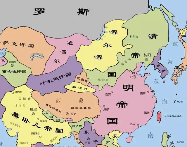 明朝时期,青藏高原同样是吐蕃各部控制,在1642年被和硕特蒙古统一,建立了和硕特汗国。而蒙古高原分裂为三部分,分别是漠西卫拉特蒙古(瓦剌)、漠南蒙古(内蒙古)和漠北喀尔喀蒙古(外蒙古)。在东北,女真族逐渐走向统一,到了1616年建立了“后金”。随后,清朝崛起了。皇太极时期,东征朝鲜,西征漠南蒙古,北征野人女真(黑龙江),南征辽西,为了清朝入关做好了准备。1644年,清朝入关,到1661年基本统一了内地,后来建立了汉地十八省。1683年,清朝又统一了台湾岛,这是第一次将台湾纳入中央王朝的版图。