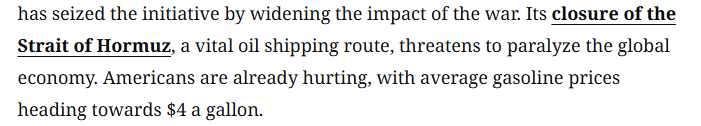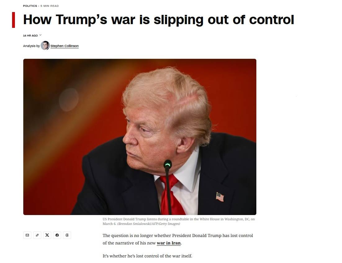 美国有线电视新闻网报道截图 “美国民众已深受其害” 文章说,尽管美国和以色列无疑已对伊朗造成了巨大破坏,但伊朗通过扩大战争影响范围,成功掌握了主动权。伊朗关闭了重要的石油运输通道霍尔木兹海峡,这一举动可能使全球经济陷入瘫痪。美国民众已深受其害,汽油平均价格正逼近每加仑4美元。